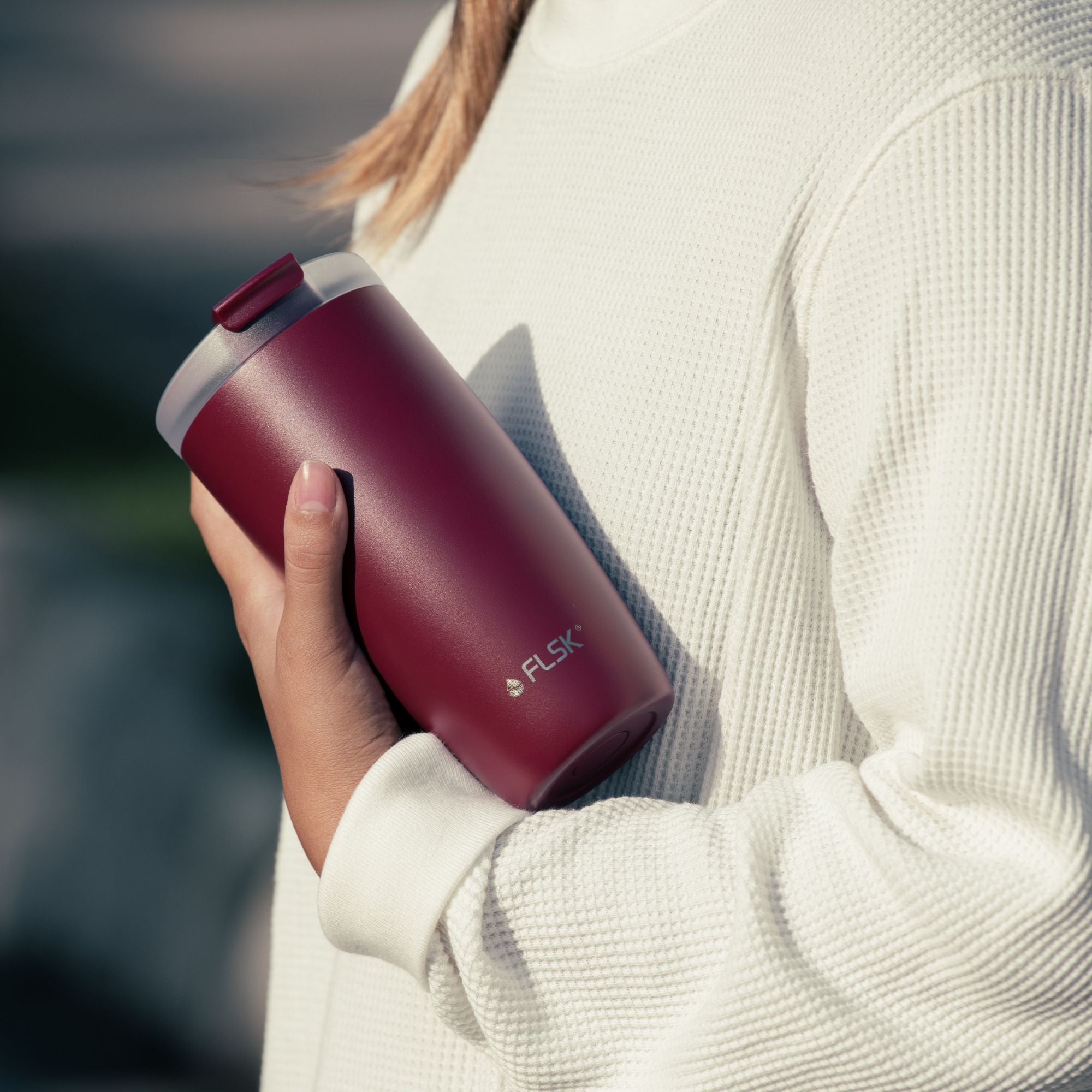 Con la tazza da caffè FLSK la tua bevanda rimane calda e ben chiusa mentre sei in viaggio.
