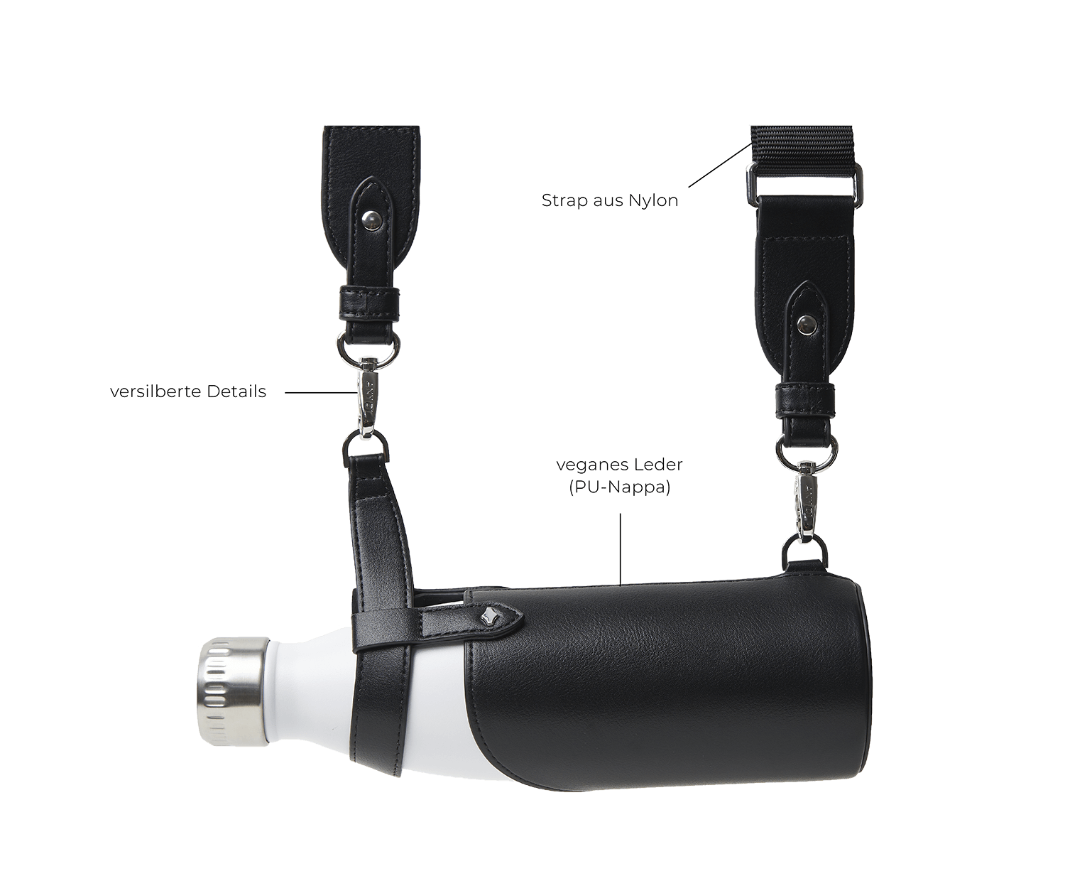 The bottle bag is made of a soft, vegan leather (PU nappa). This is a particularly high-quality imitation leather with a soft and pleasant feel. Silver-plated metal elements refine your bottle bag.